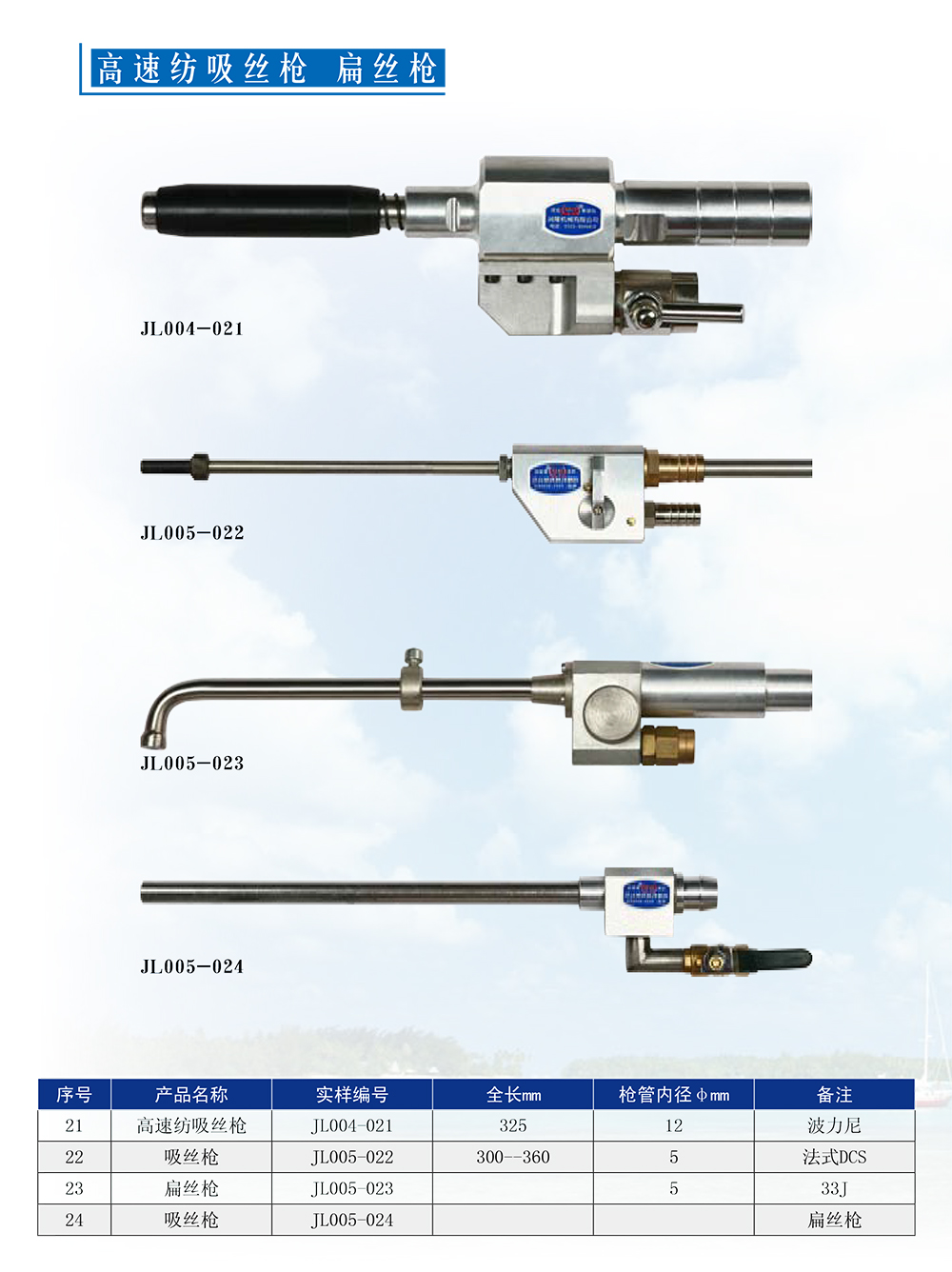 主營(yíng)各種系列吸絲槍和各種規(guī)格快速插座、升絲拉桿為主。吸絲槍主要包括高速紡FDY、 POY、短絲槍、工業(yè)絲槍?zhuān)廌TY、加彈機(jī)系列。來(lái)圖來(lái)樣生產(chǎn)。